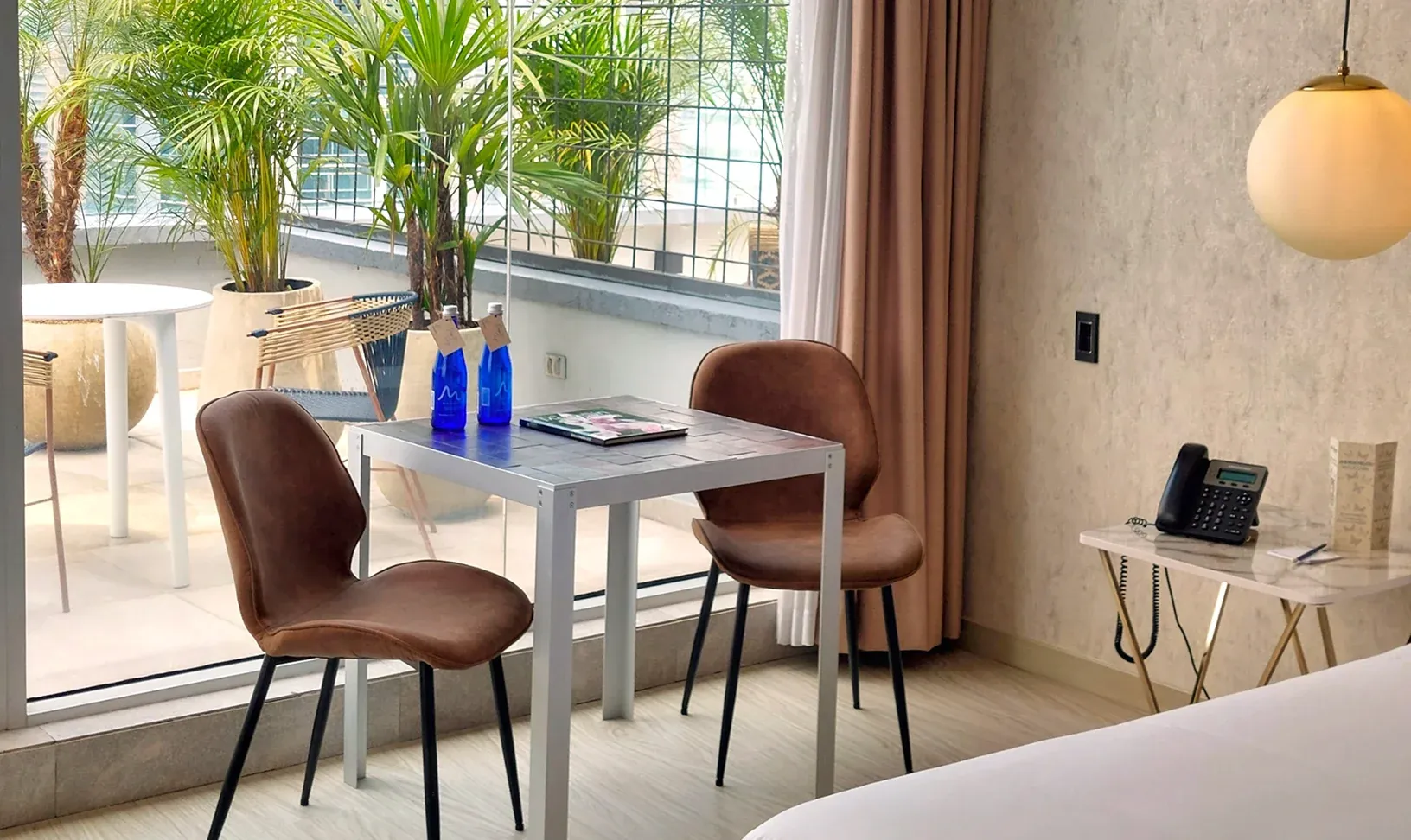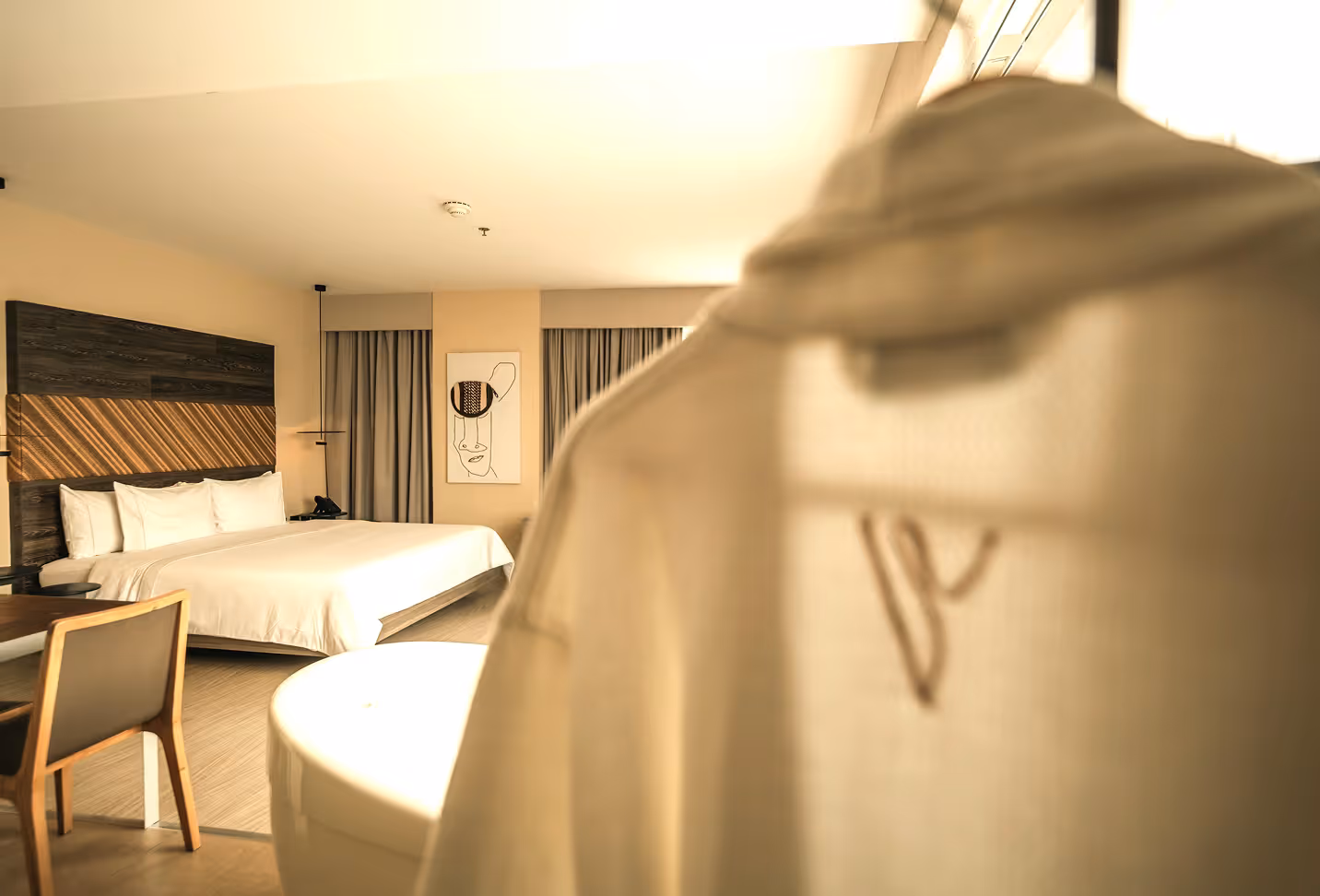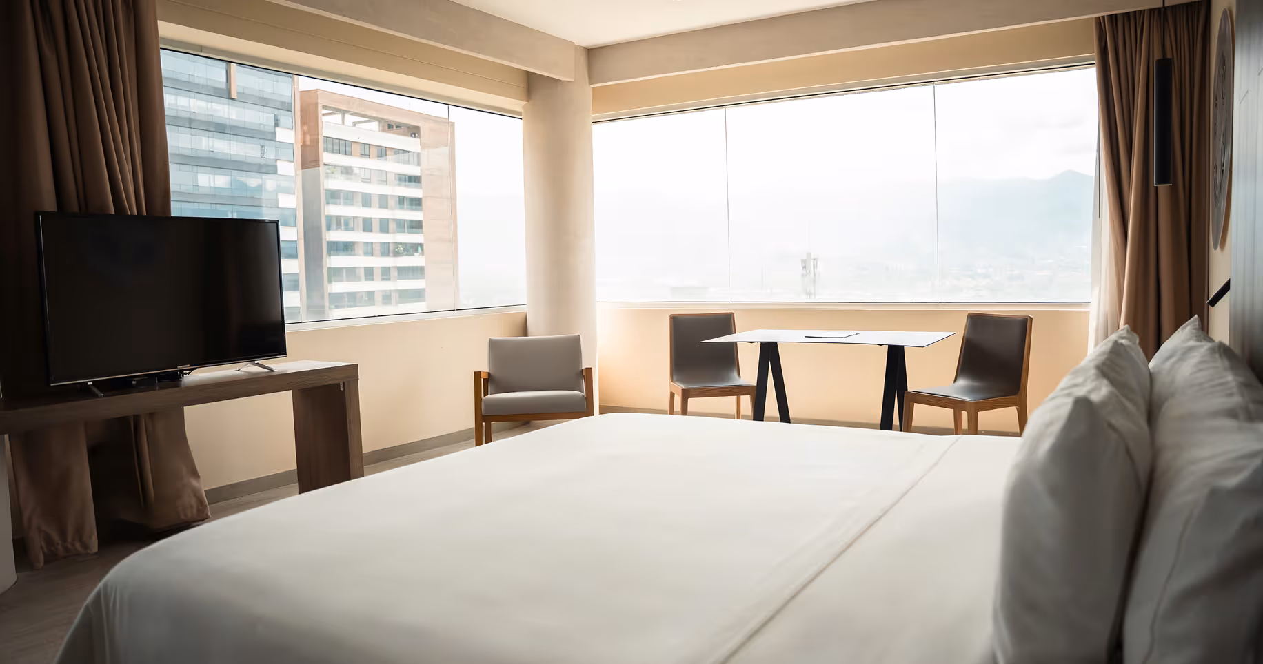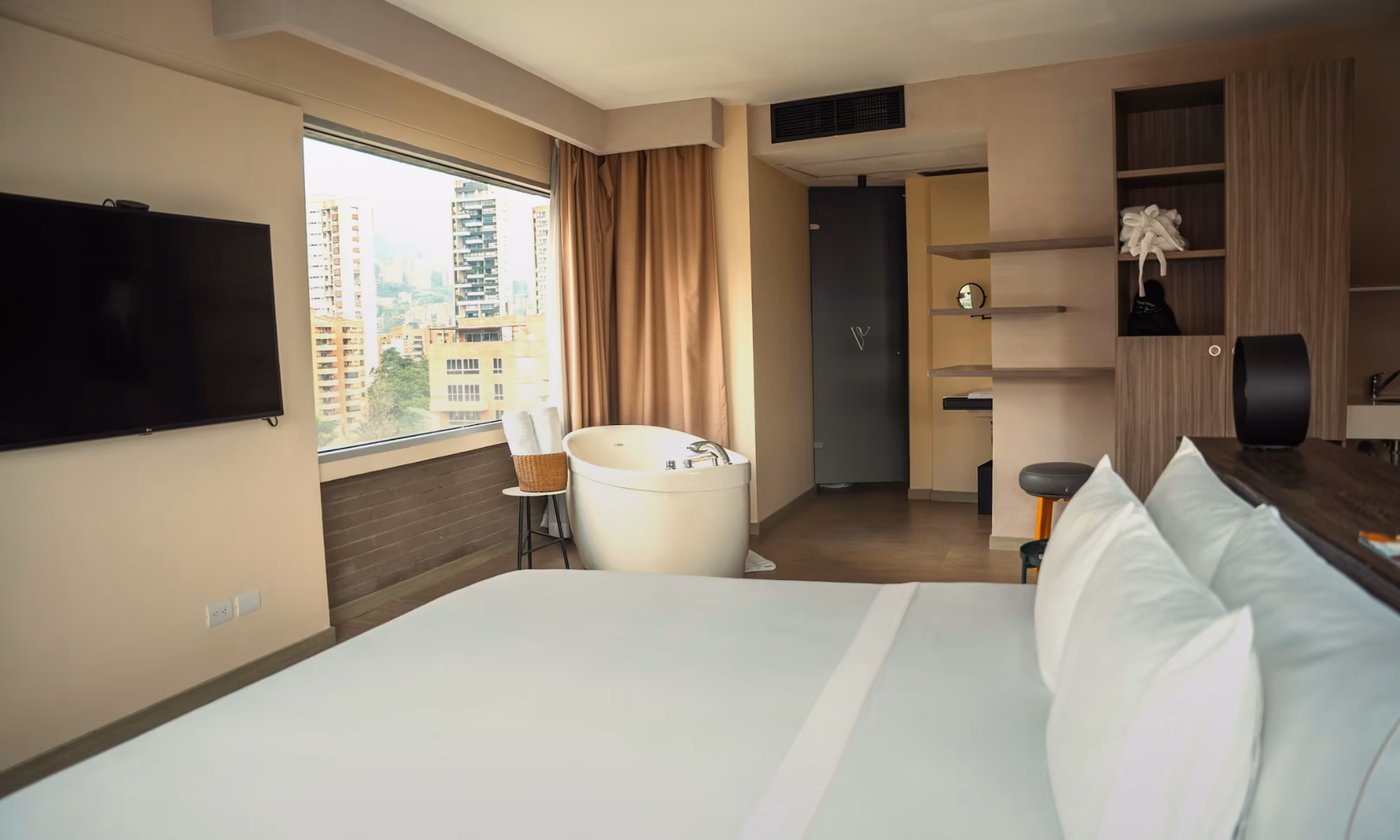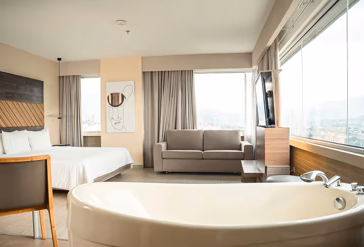 Localizada nos andares mais altos do hotel, esta suíte oferece uma vista panorâmica de Medellín que transforma cada momento em uma experiência. Conta com cama king size e detalhes que acompanham seus rituais de bem-estar: ler, meditar ou simplesmente contemplar.