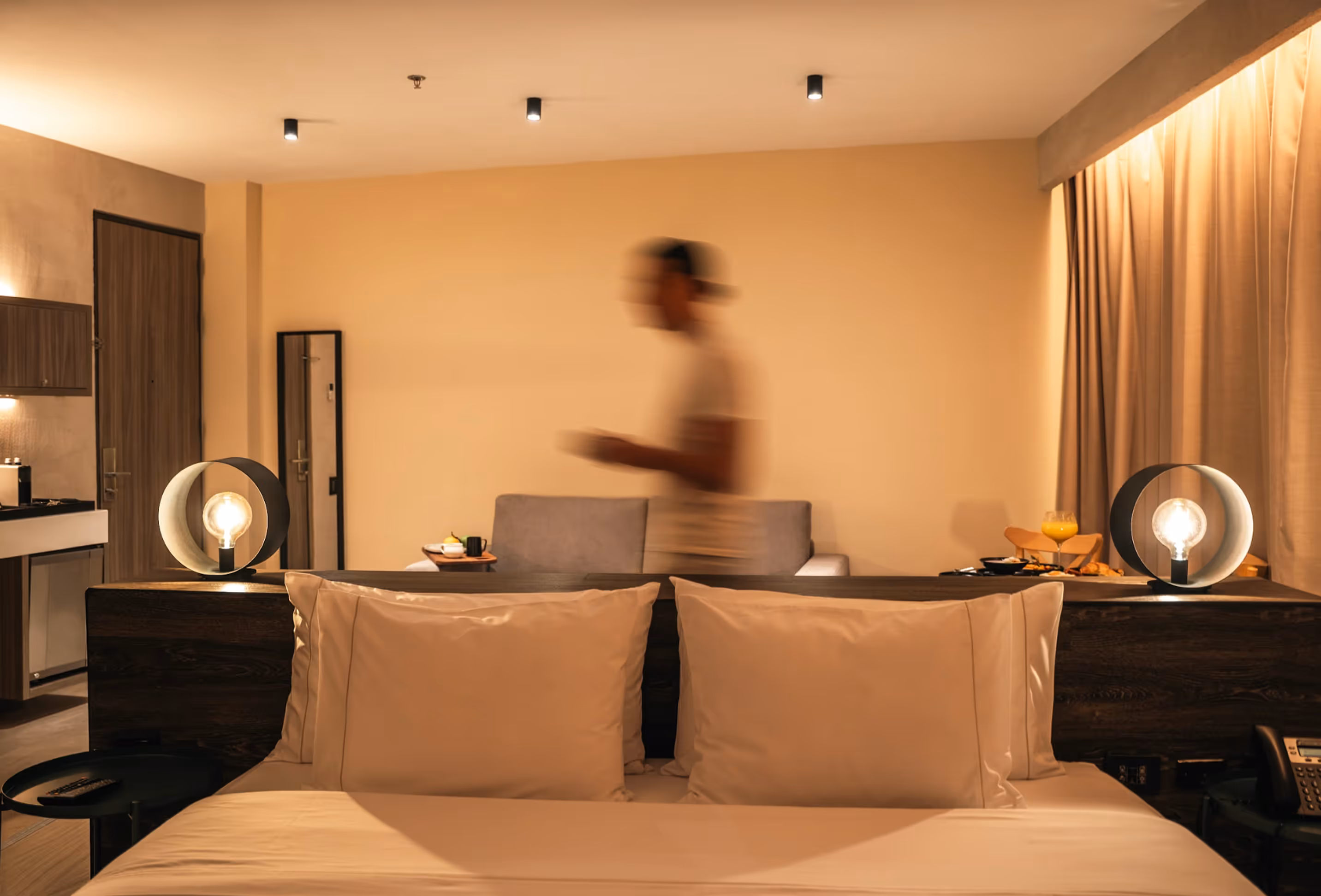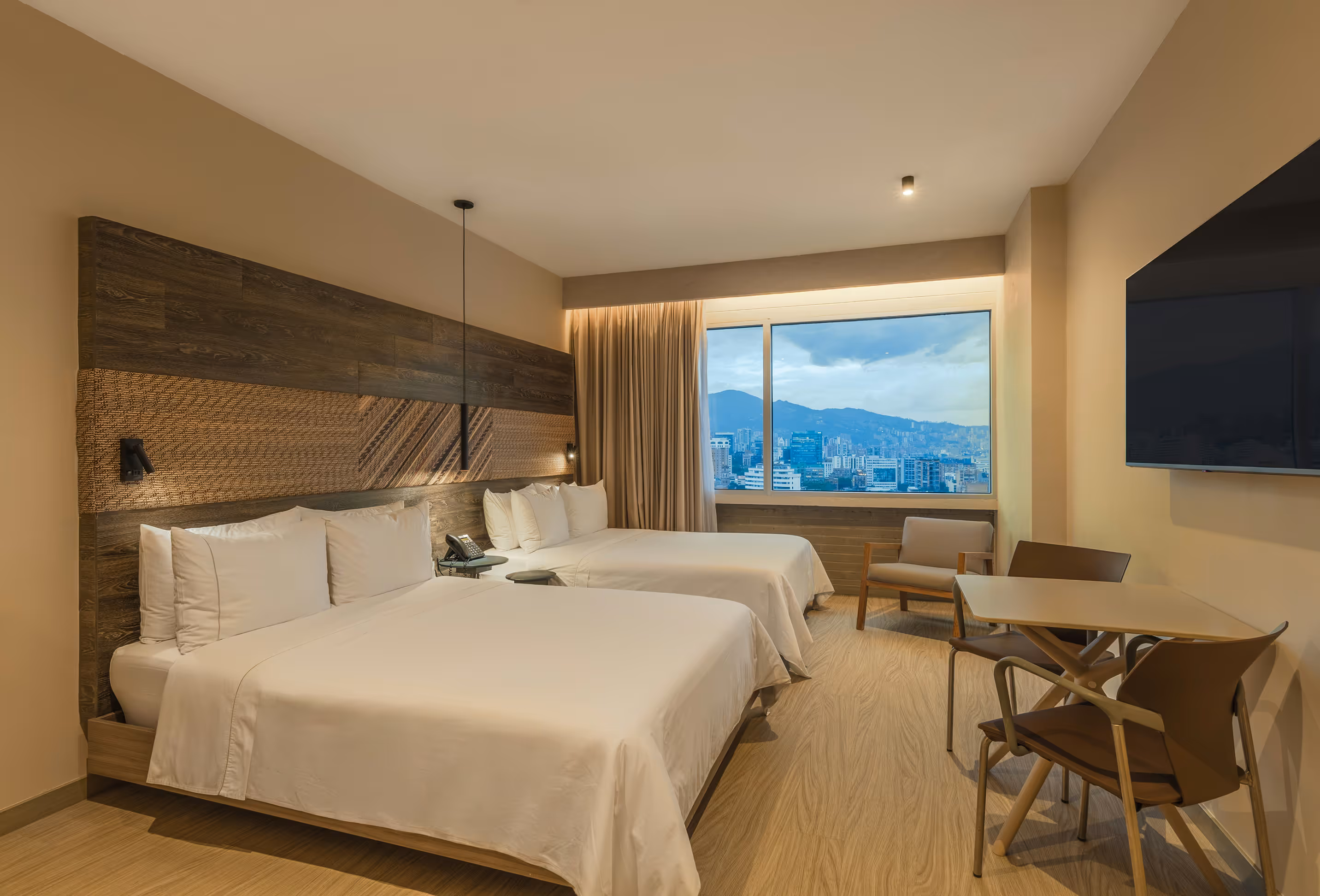 Projetado para compartilhar sem comprometer a privacidade nem o conforto. Desfrute de duas camas de casal, uma mesa auxiliar de trabalho e uma atmosfera sofisticada que equilibra produtividade e relaxamento.